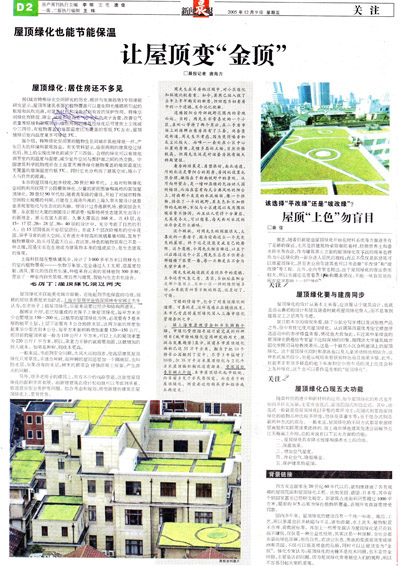 据顾正介绍,在已经建成的老房子上做屋顶绿化,每平方米至少也要增加150—200元。以植草的屋顶绿化为例,必须要有5厘米厚的植草土层,土层下还要有3公分的排水层,这两方面的厚度加起来至少要达到8公分。每平方米面积将增加重量120—150公斤。而目前的屋顶承重一般为110公斤/平方米,可以上人的屋顶承重为220公斤/平方米。所以,承重力不够的就需要加固,这就增加的投入成本。如果是种树,则成本更高。
